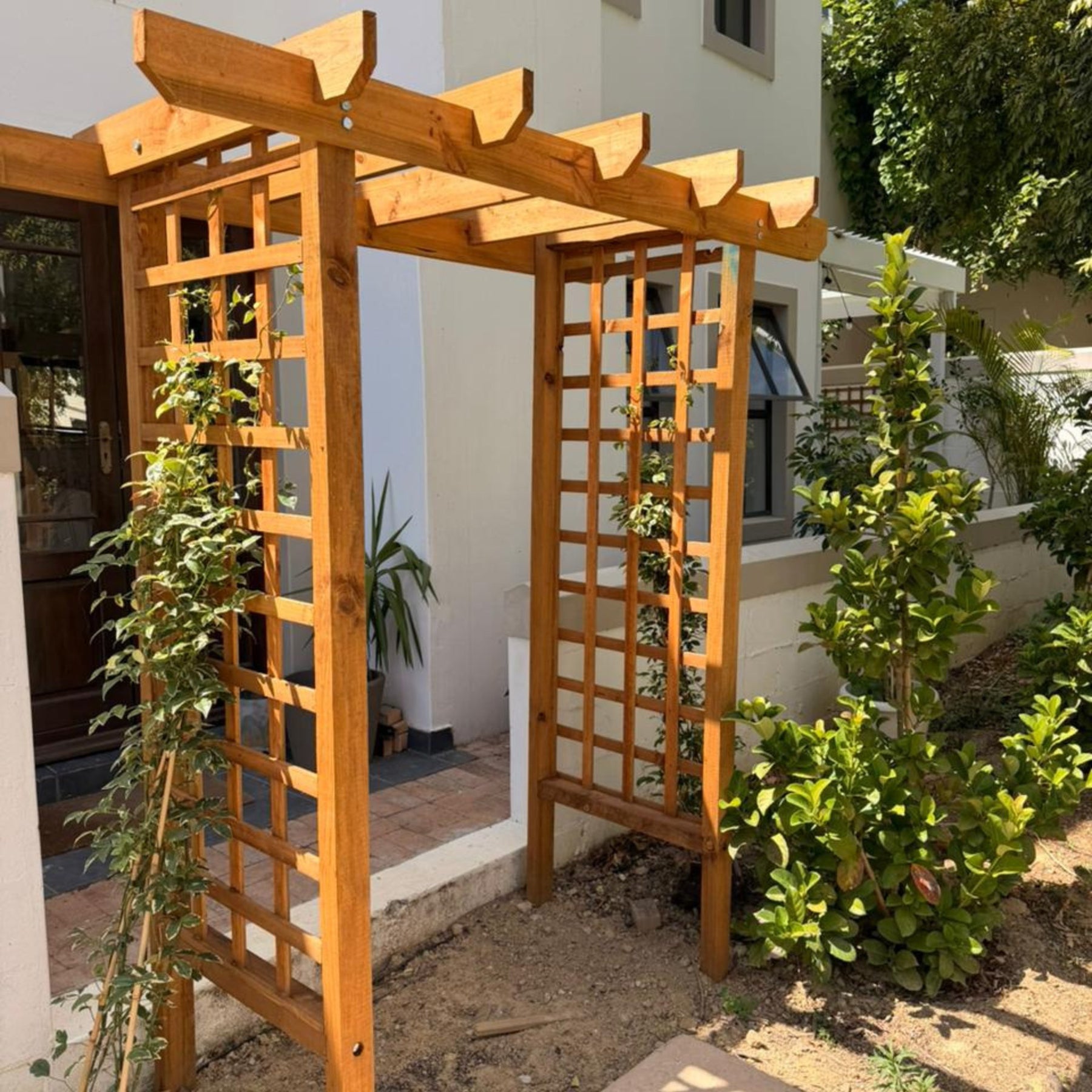 Position the trellis against a wall, fence, or in a garden bed. Secure firmly into the soil or attach to a structure for stability. Train climbing plants by gently tying stems to the trellis as they grow. Ideal for bougainvilleas, jasmine, beans, peas, and other climbers.